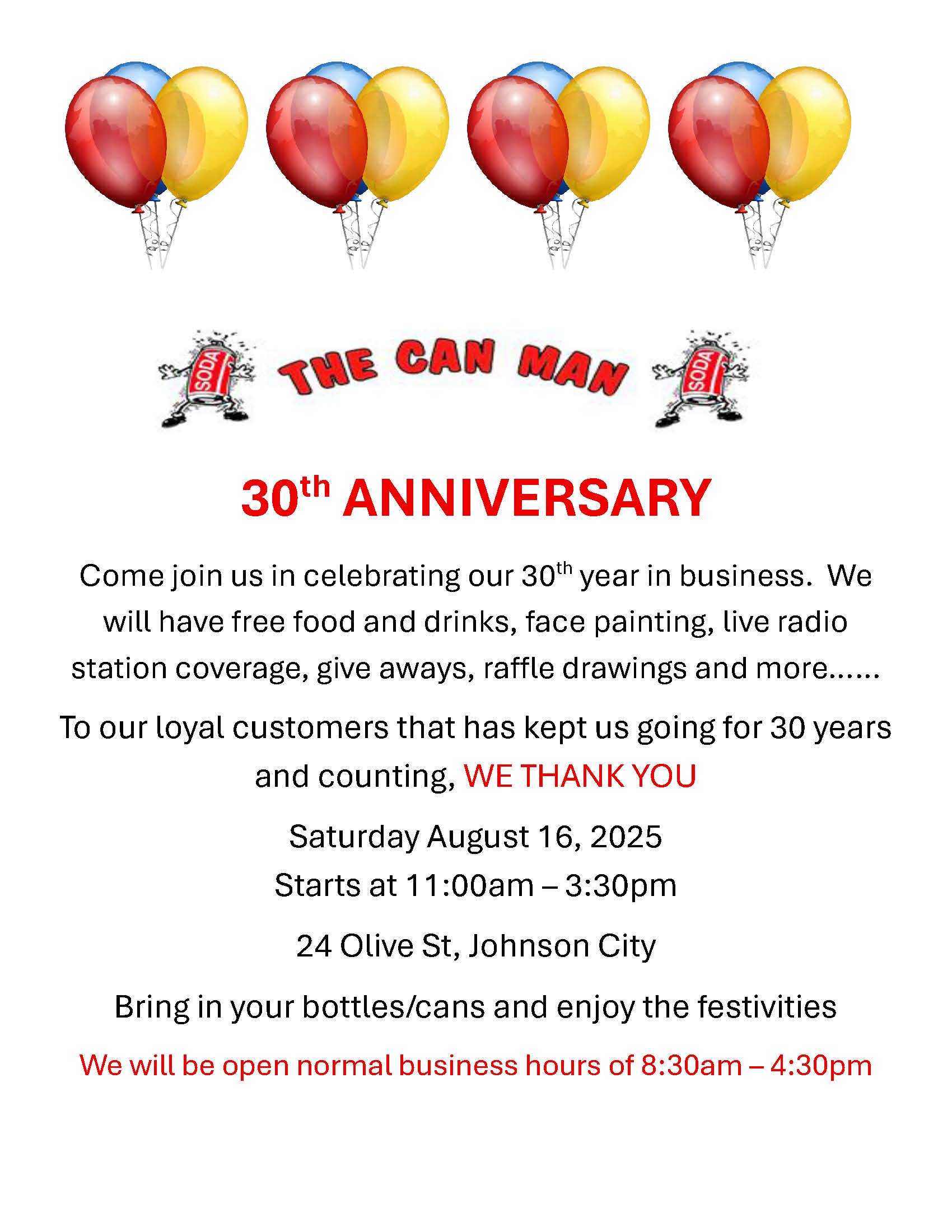 In 1995, a husband and wife dedicated themselves to picking up Deposit Containers from homes in their community and paying for them on pickup. From these humble beginnings, The Can Man now employs 10-15 people in Johnson City. We operate two trucks and perform around 20-25 scheduled pickups for homes, business, schools and bottle drives. Returning your deposit containers has never been easier or more impactful.